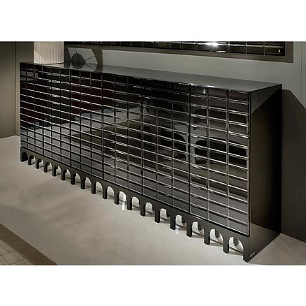 This credenza covered by glossy black lacquer has a rigid and masculine look. Amazing design is inspired by Antique Roman architecture.