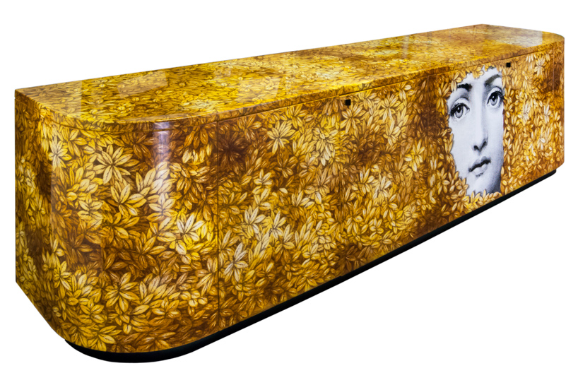 Designer Barnaba Fornasetti continues traditions of his legendary father. “Fogliolina” means small leaf in Italian and this amazing cupboard is covered with abundant golden foliage. Barnaba used the famous “Leopardo” chest created by his father in 1950s as the basement and added some of his own features like the face of Lina Cavalier, legendary Italian singer, replacing the animal’s image. This is a unique furniture piece which is hand painted and then lacquered also by hand. This credenza comes in different sizes, the smallest of which has only two doors, while the largest has four.